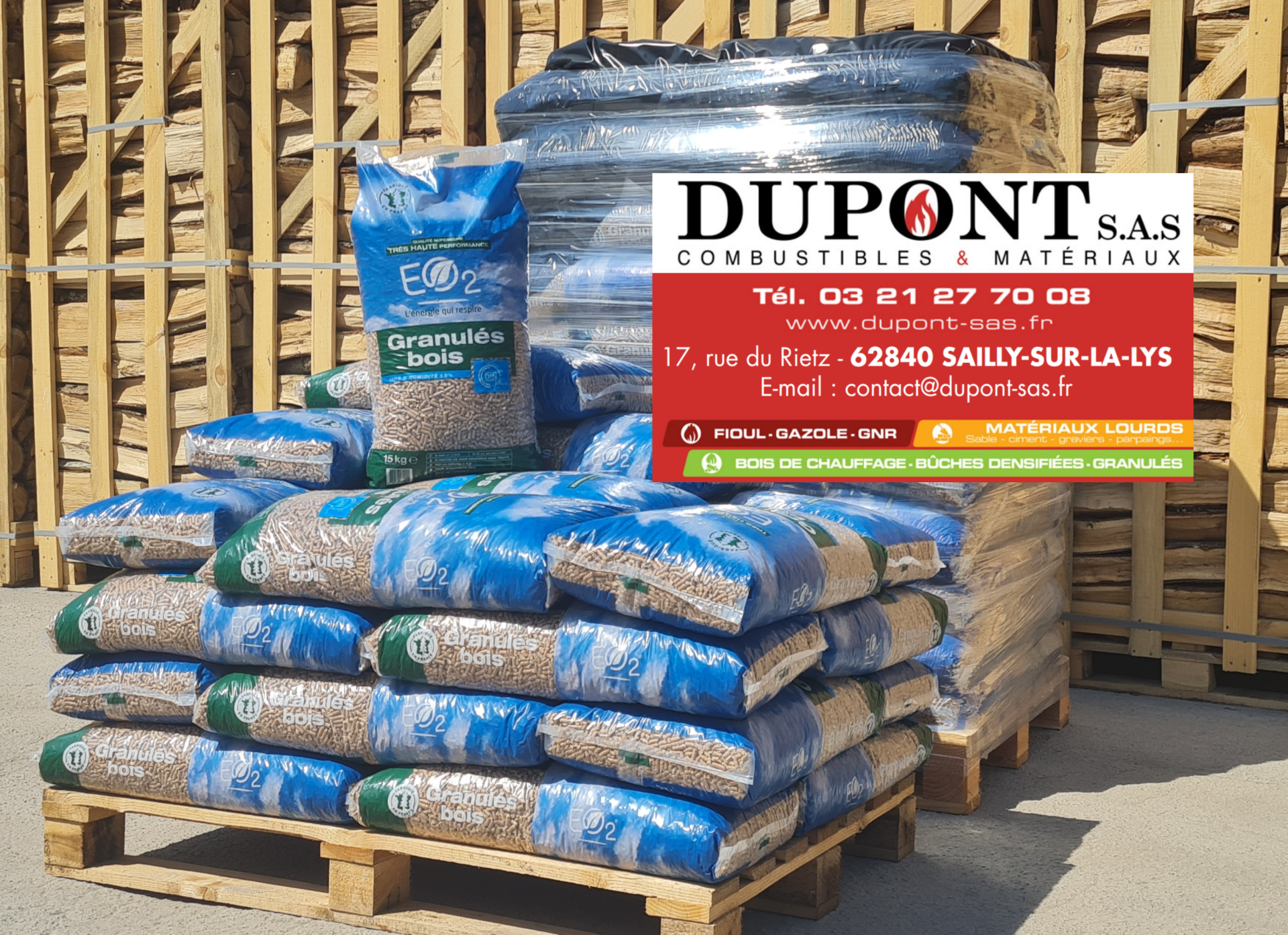 La société est située au cœur du triangle Béthune, Lille et Hazebrouck. Nous sommes à 10 km d'Armentières. Nous disposons d'un DRIVE pour retirer des sacs de pellets, packs bûches densifiées, sacs d'allumes feu..., d'un relais PICKUP pour déposer ou retirer vos Colis et d'un parking réservé à la clientèle. Pour les livraisons, nous intervenons dans un rayon de 25 km autour de Sailly-sur-la-Lys, (Steenwerck, Estaires...)